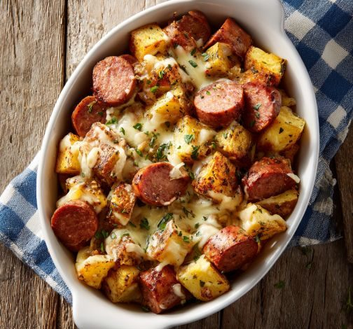 Oven-Baked Cheesy Sausage and Potato Bake This Oven-Baked Cheesy Sausage and Potato Bake is a rustic, no-fuss sheet-pan dinner that delivers big comfort with minimal effort. Roasting at high heat allows the potatoes to turn golden and crisp while the sausage caramelizes beautifully. Giving the potatoes a head start ensures they become perfectly tender without overcooking the sausage. A blanket of melted cheddar brings everything together, complementing the earthy thyme and savory, smoky sausage. Ingredients Base 2 lbs potatoes, peeled and cubed 1 lb sausage (any variety you like), sliced 1 tbsp olive oil Seasoning & Finish 1 cup shredded…