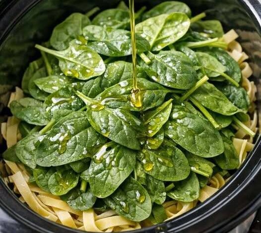 Add fresh spinach and pasta to the slow cooker with 4 simple ingredients for a meal so tasty your friends won’t stop asking for seconds