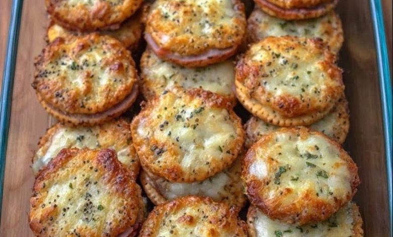 These easy, savory baked appetizers are mini ham and Swiss sandwiches topped with a buttery, savory glaze and poppy seeds. Ingredients: INGREDIENTSAMOUNTRitz crackers48Deli ham, sliced8 slicesSwiss cheese, sliced8 slicesButter, melted4 tablespoonsDijon mustard2 teaspoonsWorcestershire sauce1 teaspoonGarlic powder1/2 teaspoonPoppy seeds1 teaspoonDried minced onion1/2 teaspoon How To Make Ritz Cracker Party Sandwiches: Step 1: Preheat and Prep: Preheat oven to 350F (175C). Place half of the 48 Ritz crackers (24 crackers total) in a 9×13-inch baking dish, flat side down. Step 2: Assemble Sandwiches: Tear the 8 slices of deli ham into small strips and fold, then place a small amount of ham on each…