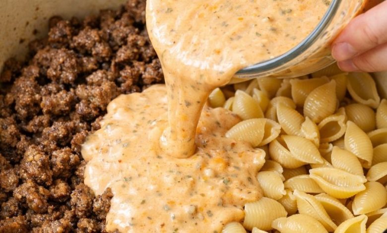 This Creamy One-Pot Beef and Shells is the ultimate upgrade to the classic “hamburger helper” style of cooking. By simmering the raw pasta directly in a blend of beef broth, heavy cream, and tomato paste, the shells release their starches into the liquid, naturally thickening it into a velvety, restaurant-quality sauce. It’s a hearty, comforting meal that minimizes cleanup by handling everything—from browning the beef to melting the cheese—in a single Dutch oven. Ingredients: IngredientAmountGround beef (80–90% lean)1 1/2 lbsUncooked medium pasta shells12 ozBeef broth2 cupsHeavy cream1 1/2 cupsShredded sharp cheddar (divided)1 1/2 cupsTomato paste3 tablespoonsYellow onion (diced)1 mediumGarlic (minced)2 clovesItalian seasoning2 teaspoonsOlive oil1 tablespoonOptional:Red…