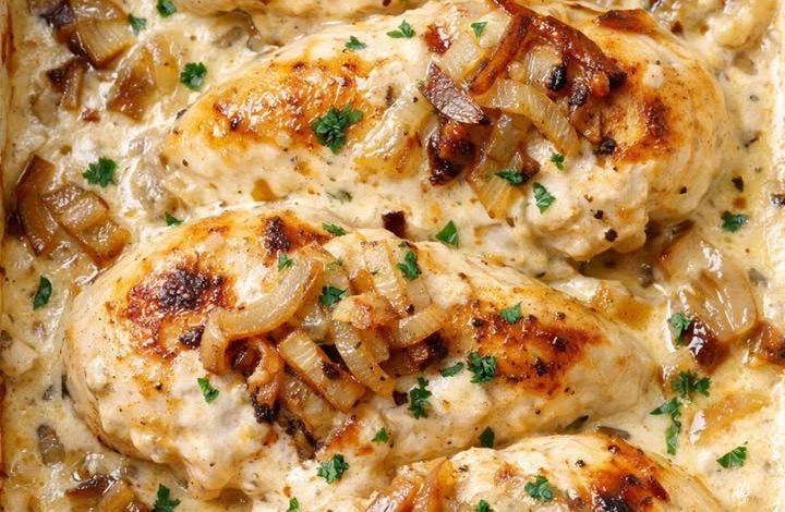 This Oven-Baked Sour Cream Onion Chicken is a simple yet rich dish that turns just a few ingredients into something incredibly tender and full of flavor. The sour cream creates a creamy coating over the chicken, while the thinly sliced onions soften and lightly caramelize as everything bakes together. The result is a smooth, tangy sauce that feels much more complex than the recipe suggests. Oven-Baked Sour Cream Onion Chicken (3 Ingredients) Ingredients: 4 chicken breasts (about 2 lbs) 2 cups sour cream 2 large yellow onions, thinly sliced 1 tsp kosher salt (optional) ½ tsp black pepper (optional) Instructions:…
