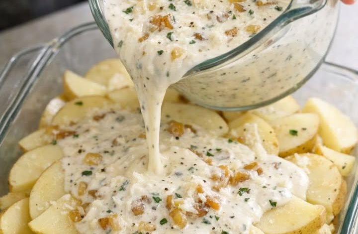 These Creamy Pour-Over Baked Potatoes are the ultimate cozy side dish, turning simple ingredients into a rich, velvety gratin. It begins with slowly cooked onions that become soft and golden, adding a gentle sweetness that pairs beautifully with savory Parmesan. Using the pour-over method, thinly sliced potatoes are soaked in a seasoned cream mixture, allowing every layer to absorb the flavors of thyme, onion, and cheese as it bakes into a bubbling, golden-topped dish. Creamy Pour-Over Baked Potatoes Ingredients: Russet or Yukon Gold potatoes — 3 lbs Heavy cream — 2 cups Parmesan cheese (finely grated) — 1 cup +…