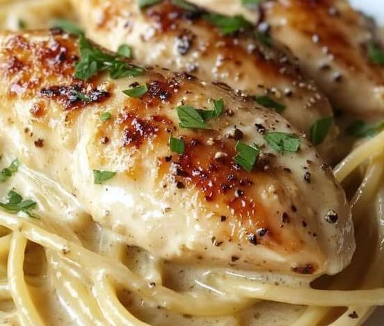 Toss the cooked pasta with the creamy sauce and top with the baked chicken. Garnish with fresh chives if desired.