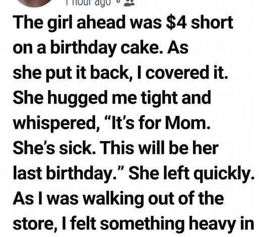 The grocery store carried its usual Tuesday haze—fluorescent lights humming overhead, scanners chirping, shoppers drifting through the aisles with quiet urgency. I blended into the routine like anyone else—until I noticed her. A young girl, maybe ten years old, stood at the checkout holding a birthday cake as if it might slip away at any second. When the cashier announced the price, her expression sank. She hesitated, then slowly began to pull back, her eyes filling with the kind of silent disappointment only a child can feel when something meaningful is just out of reach. Without…