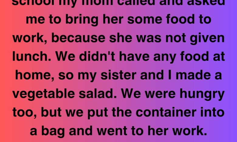 That afternoon, when I got home from school, my mom called and asked for a favor. She hadn’t eaten all day at work and said she was starving. Our fridge was nearly bare—just a few vegetables left. My sister and I did what we could, tossing together a simple salad. We were hungry too, but we packed it carefully in a container and walked it over to her workplace. When we arrived, we found her in the breakroom with a coworker named Mrs. Danika. She was a gentle woman in her mid-50s, soft-spoken and visibly worn out. She rubbed her…