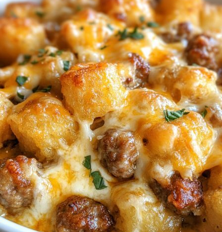 Cheesy Tater Tot and Sausage BakeThis hearty and comforting dish is a weeknight lifesaver. With savory ground sausage, a creamy cheesy filling, and a crispy tater tot topping, this all-in-one casserole is quick to prepare and packed with flavor. It’s the kind of meal the whole family will ask for again and again. Ingredients: IngredientAmountGround sausage1 poundOnion, finely diced1 smallCheddar cheese, shredded2 cupsCream of mushroom soup1 can (10.5 oz)Milk½ cupGarlic powder½ teaspoonGround black pepper½ teaspoonFrozen tater tots1 bag (32 oz) Instructions: Step 1: Preheat & Cook SausageSet your oven to 375°F (190°C). In a large skillet, sauté the ground sausage…