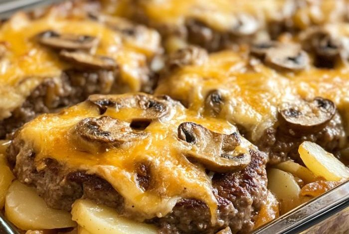 Amish Hamburger Steak Bake This cozy and filling Amish-style bake is like something straight from a farmhouse kitchen. Juicy hamburger patties rest on a bed of sliced potatoes and onions, all covered in a rich mushroom gravy and finished with melted cheddar cheese. It’s a hearty one-pan meal perfect for feeding the family. Ingredients: IngredientQuantityGround beef1 poundGarlic powder1 teaspoonOnion powder1 teaspoonSalt1 teaspoonBlack pepper½ teaspoonDried thyme½ teaspoonOlive oil2 tablespoonsSliced mushrooms1 cupAll-purpose flour2 tablespoonsMilk1 ½ cupsMedium potatoes, sliced thin4Large onion, sliced thin1Shredded cheddar cheese1 cup Instructions: Step 1: Prepare and Sear the PattiesStart by preheating your oven to 350°F (175°C). In a…