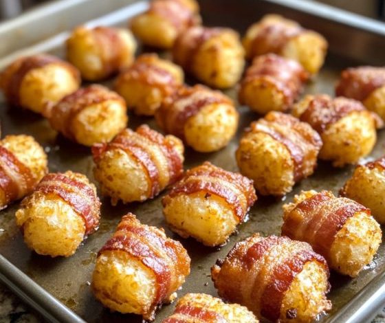 These Baked Bacon-Wrapped Tater Tots are the perfect combination of sweet, savory, and crispy. Frozen tater tots are wrapped in bacon, coated in a smoky-sweet brown sugar and chili powder rub, and baked to a golden, crunchy finish. They make an irresistible appetizer for parties, game days, or a fun snack for the family. Ingredients: IngredientQuantityFrozen tater tots24Bacon12 slices, cut in halfBrown sugar¼ cupChili powder1 teaspoonToothpicksAs needed How To Make Baked Bacon-Wrapped Tater Tots: Prep Oven & Baking Sheet: Preheat your oven to 400°F (200°C). Line a baking sheet with aluminum foil and place a wire rack on top. Make the Coating: In a small bowl,…