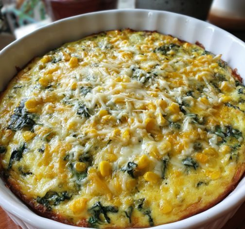 Oven-Baked Cheesy Corn and Spinach CasseroleThis warm and hearty casserole combines the natural sweetness of corn, the wholesome flavor of spinach, and the creamy richness of cheddar cheese. It’s a no-fuss, comforting side dish that’s quick to prepare—ideal for both busy weeknights and festive gatherings. Ingredients: IngredientQuantityFresh spinach leaves2 cupsCorn kernels (drained)1 can (15 oz)Large eggs3Shredded Cheddar cheese1 cupMilk½ cupAll-purpose flour¼ cupSalt½ teaspoonBlack pepper¼ teaspoonGarlic powder¼ teaspoonButter (for greasing)1 tablespoon Instructions: Preheat & Prep:Set your oven to 375°F (190°C). Lightly butter a medium-sized baking dish to prevent sticking. Make the Mixture:In a large bowl, whisk together the eggs, milk, flour,…