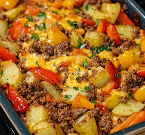 Oven-Baked Southwestern Beef and Pepper BakeThis hearty and flavorful one-pan meal brings together seasoned ground beef, tender potatoes, and a vibrant medley of bell peppers—all smothered in melted cheddar cheese. It’s a comforting, easy-to-make dish that’s perfect for busy weeknights. Ingredients: IngredientQuantityGround beef1 poundOlive oil1 tablespoonOnion, diced1Garlic, minced2 clovesRed bell pepper, diced1Yellow bell pepper, diced1Green bell pepper, diced1Diced potatoes2 cupsGround cumin1 teaspoonChili powder1 teaspoonSalt and pepperTo tasteShredded Cheddar cheese1 cupOptional: Fresh cilantro, chopped¼ cup Instructions: Prepare Oven & Skillet:Preheat your oven to 375°F (190°C). Heat the olive oil in a large skillet over medium heat. Sauté & Brown:Add diced onion…