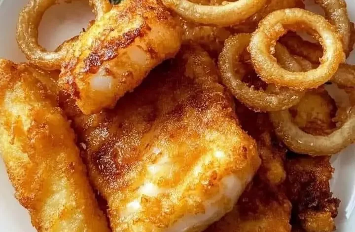 Flaky, golden, and satisfyingly crisp—this dish is comfort food done right. When those crunchy cravings strike, this pairing of tender fried cod and seasoned onion rings delivers the ultimate indulgence. It’s perfect for a cozy family dinner, a weekend splurge, or a crowd-pleasing game-day meal. 🧾 Ingredients For the Crispy Cod Cod fillets – 4 (6 oz each) All-purpose flour – 1 cup Panko breadcrumbs – 1 cup Cornmeal – ½ cup Paprika – 1 tsp Garlic powder – ½ tsp Onion powder – ½ tsp Salt – ¼ tsp Black pepper – ¼ tsp Eggs – 2 large Vegetable…