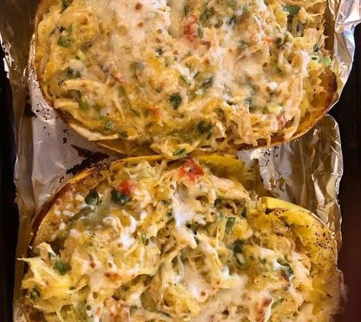 Green Chile Chicken-Stuffed Spaghetti Squash This Green Chile Chicken-Stuffed Spaghetti Squash is a delicious and hearty low-carb meal. Roasted spaghetti squash strands are combined with a creamy, spicy chicken mixture, then topped with melted Mexican cheese and baked to perfection. It’s a comforting and wholesome dish all in one. Ingredients: 1 large spaghetti squash, halved lengthwise 2 cups shredded cooked chicken 1 (4 oz) can diced green chiles 1 green onion, thinly sliced ½ cup green enchilada sauce ½ cup fresh or frozen corn ½ cup Mexican cheese blend ¼ cup crema 1 teaspoon chili powder (plus extra for garnish,…