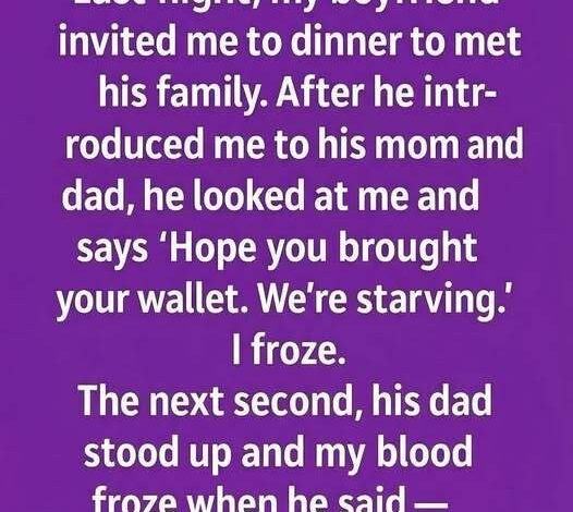 Last night, my boyfriend invited me to dinner to meet his family for the first time. I had spent hours choosing the right outfit and rehearsing polite introductions in my head. When we arrived, his parents greeted me warmly, but just as we sat down, he smiled and said, “Hope you brought your wallet. We’re starving.” My heart skipped. Before I could respond, his father stood up and added with a grin, “Don’t worry, we’re only teasing.” The entire table burst into laughter. My nerves were on full display, and my boyfriend quickly squeezed my hand, reassuring me that playful…