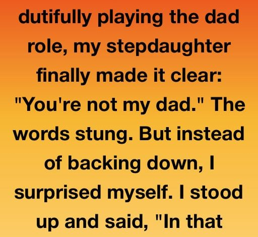 She said it like flicking a switch: “You’re not my dad.” It didn’t make me angry — just emptied me out. Ten years of teaching her to ride a bike, sitting up through fevers, clapping at school plays, patching scraped knees, and listening through teenage storms — and still, I was just Mike. So this time, I didn’t stay silent. I stood my ground. “In that case,” I said evenly, “you can’t keep throwing punches and expect me to pretend it doesn’t hurt.” Her eyes widened. She wasn’t used to me saying anything back. Then came the door slam. Curtain…