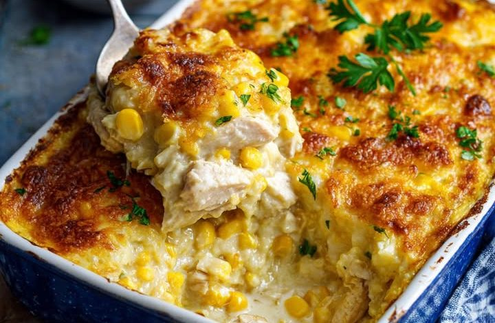 This comforting Oven-Baked Creamy Corn and Chicken Casserole is a simple, satisfying dish made with tender shredded chicken, a blend of sweet and creamy corn, and a rich, cheesy sauce baked until bubbly and perfectly golden on top. Oven-Baked Creamy Corn and Chicken Casserole Ingredients: 2 cups cooked shredded chicken 1 can (15 oz) corn kernels, drained 1 can (15 oz) cream-style corn 1 cup sour cream 1 cup shredded cheddar cheese 1/2 cup chopped green onions 1/4 cup all-purpose flour 1/2 cup milk 1 teaspoon salt 1/2 teaspoon black pepper 1/2 teaspoon paprika 1 tablespoon butter Fresh parsley, for…
