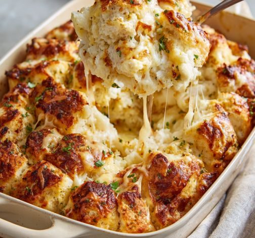 This incredibly simple casserole comes together with canned biscuit dough and a quick garlic-butter coating, resulting in a cheesy, savory pull-apart bake that’s perfect for gatherings. 4-Ingredient Cheesy Pull-Apart Potluck Casserole Ingredients IngredientAmountRefrigerated biscuit dough (homestyle or buttermilk)2 cans (16 oz)Shredded cheese (cheddar, mozzarella, or a blend)3 cupsSalted butter, melted1/2 cupGarlic powder1 tbsp Instructions 1. Preheat & Prepare Set your oven to 350°F (175°C). Lightly coat a 9×13-inch baking dish with butter or nonstick spray. 2. Cut the Biscuits Open the biscuit cans, separate the individual biscuits, and cut each one into four smaller pieces using a sharp knife or…