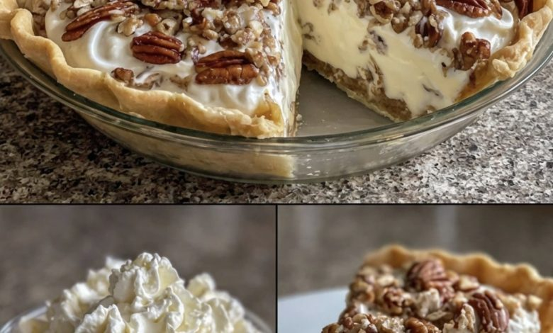 This pecan cream pie is a lighter, mostly no-bake twist on the traditional sticky-sweet version. The filling is smooth and creamy like cheesecake, gently brightened with a touch of tang and softened by freshly whipped cream. Maple syrup adds warm depth, while finely chopped pecans are folded throughout for a nutty bite in every slice.