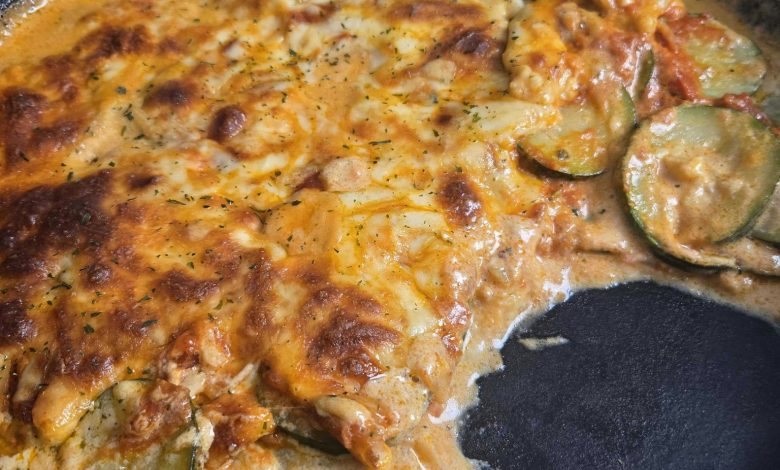This Skillet Zucchini Parmesan is a warm, comforting dish packed with flavor and made entirely in one pan. Sliced zucchini simmers in a rich Parmesan cream sauce, then gets layered with savory marinara and plenty of melty mozzarella before being baked until bubbling and golden.