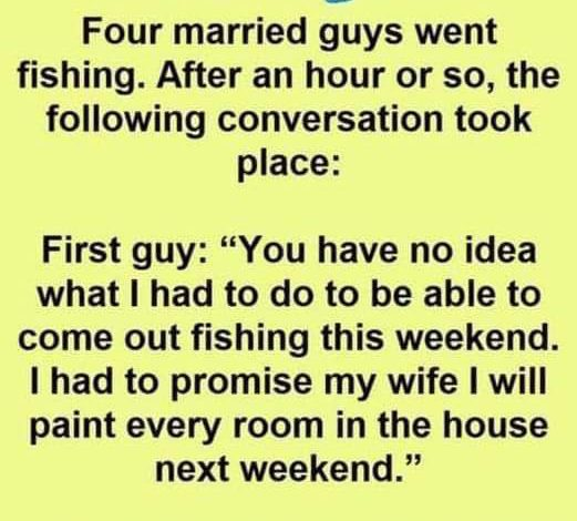 Four married men, all looking for a break from the daily grind, decided to spend a peaceful day fishing together. As they cast their lines into the calm water, the conversation naturally drifted toward the “deals” they had struck at home to earn this rare escape from household duties. Each man, between laughs, shared what he had to sacrifice for a few hours of freedom — a lighthearted competition in marital diplomacy.
