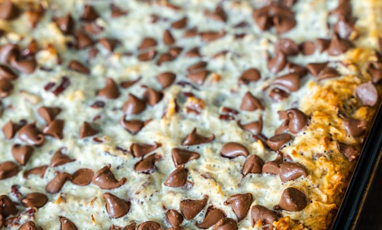While the crust is baking, stir together the sweetened condensed milk, vanilla extract, remaining egg, pecans, coconut, and salt. Spread this mixture over the warm crust, then sprinkle the chocolate chips evenly on top. - Bake again