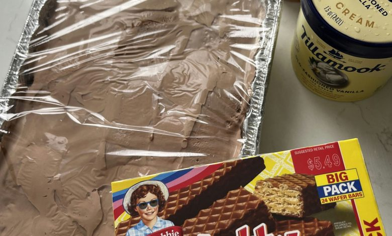 Place another layer of Nutty Buddy bars over the fudge. Let the chocolate ice cream soften, then spread it evenly across the top to create a smooth surface.