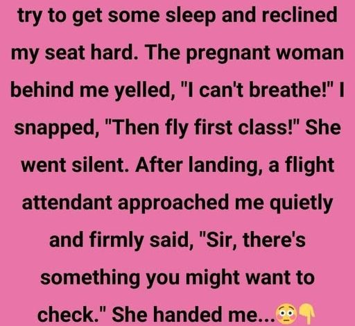 As soon as the seatbelt sign turned off, I leaned my seat back sharply, hoping to get some much-needed rest. I didn’t check behind me first. Almost immediately, the woman seated behind me, whom I later learned was pregnant, cried out, “I can’t breathe!” I was surprised, but honestly just too tired to deal with it.