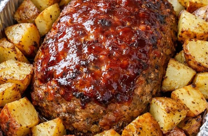 Remove the pan, stir the potatoes for even browning, and brush the remaining glaze over the meatloaf. Return to the oven and bake for another 20–25 minutes, until the meatloaf reaches an internal temperature of 160°F (71°C).