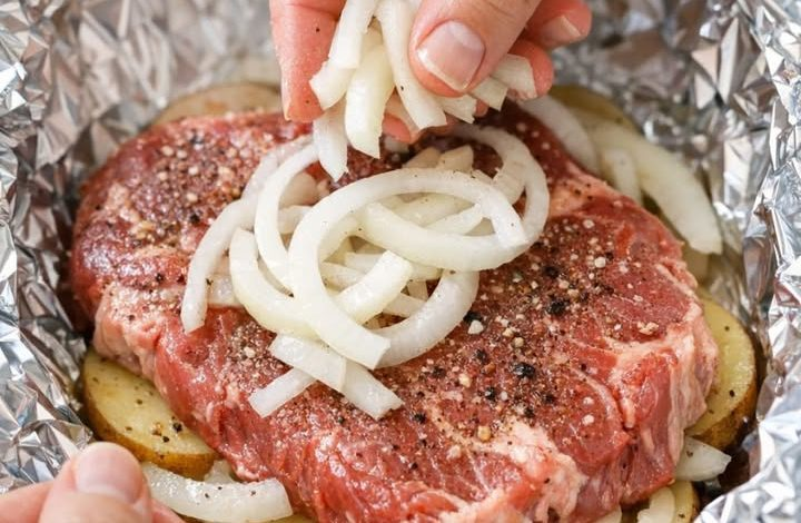 Place a layer of seasoned onions in the center of each foil sheet. Set a steak portion on top and drizzle any remaining oil or butter over the meat.