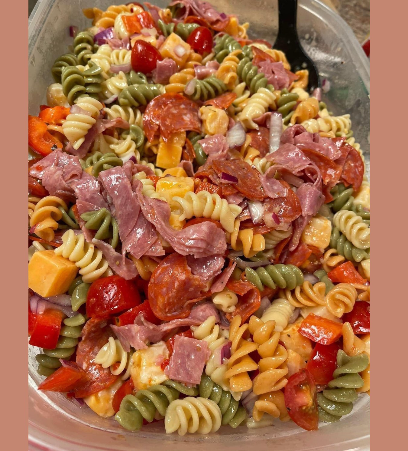 This colorful, hearty pasta salad is packed with pepperoni, salami, fresh veggies, and zesty Italian dressing—perfect for satisfying those intense pregnancy cravings (or just because it’s delicious!). Best part? No strict measurements—just toss and taste!