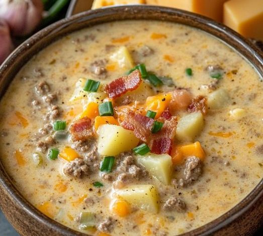 This rich and satisfying Cheesy Burger Flavored Soup brings all the mouthwatering flavors of a classic cheeseburger into a warm, creamy bowl. Ground beef, hash browns, and savory seasonings simmer together in a flavorful broth, then get finished with cheddar cheese, bacon, and cream for a truly comforting meal.