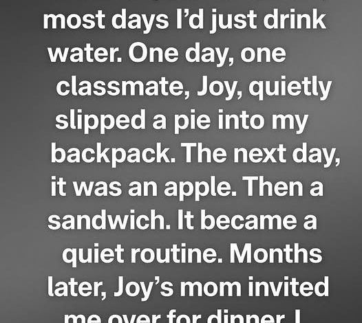 Then one day, something unexpected happened. I opened my backpack and found a small pie inside—still warm, wrapped carefully in foil. I hadn’t packed it. My mom couldn’t have. We were barely getting by.