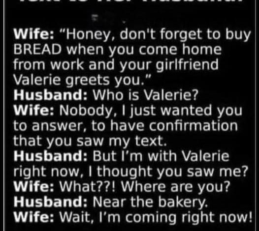 “Babe, don’t forget to grab some bread on your way home… and say hi to your girlfriend Valerie for me.”